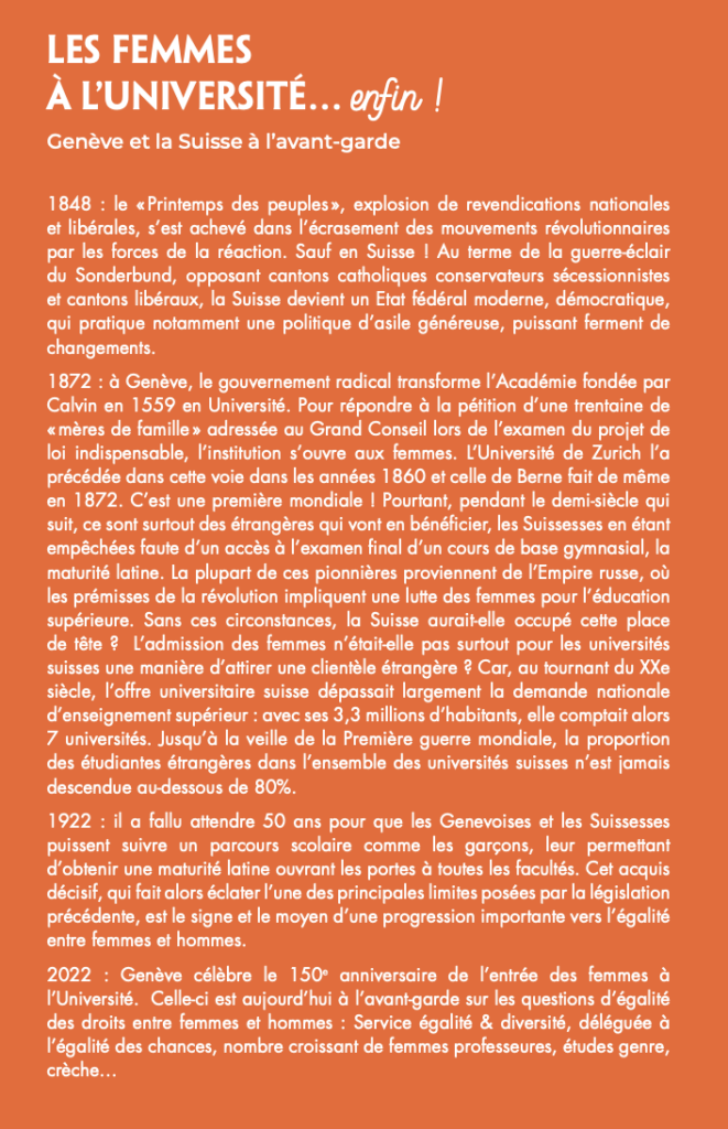 Cet ouvrage retrace la conquête de l’espace académique par les femmes à Genève, depuis leur admission en 1872 jusqu’à aujourd’hui. En mêlant histoire, portraits et analyses, il met en lumière les pionnières issues notamment de l’Empire russe et les combats pour l’égalité dans les universités suisses. Dirigé par Erica Deuber-Ziegler et Brigitte Mantilleri, il souligne le rôle moteur de Genève dans la promotion de la recherche féministe et des études de genre. Un hommage vibrant aux femmes qui ont transformé durablement le visage de l’Université.